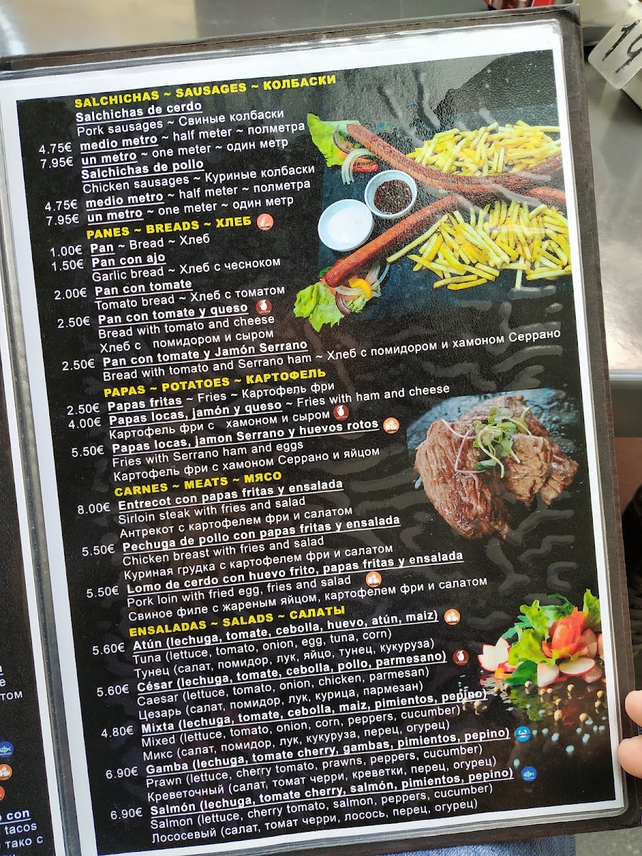 A unique and fun option on the menu is the Salchicha de 1 2 Metro, a giant sausage served in an impressive 1.5-meter length, ideal for sharing and offering a playful touch to any dining experience. The פיטריות (Mushrooms) dish is another standout, prepared with fresh, earthy mushrooms that are expertly cooked. For a classic side, סלט ירקות (vegetable salad) complements any meal with its crisp and refreshing flavors.